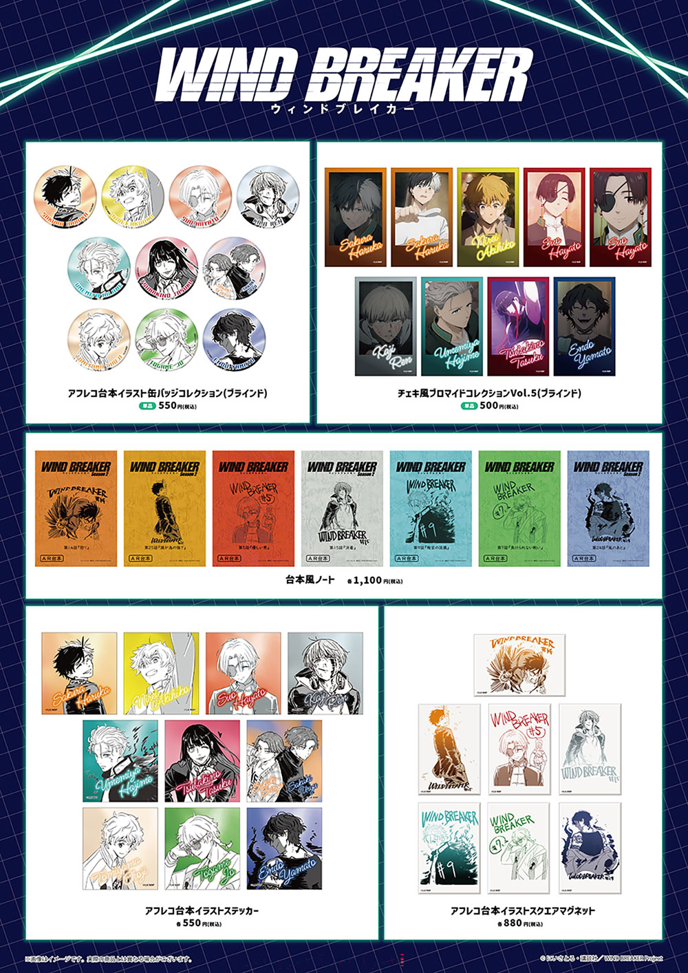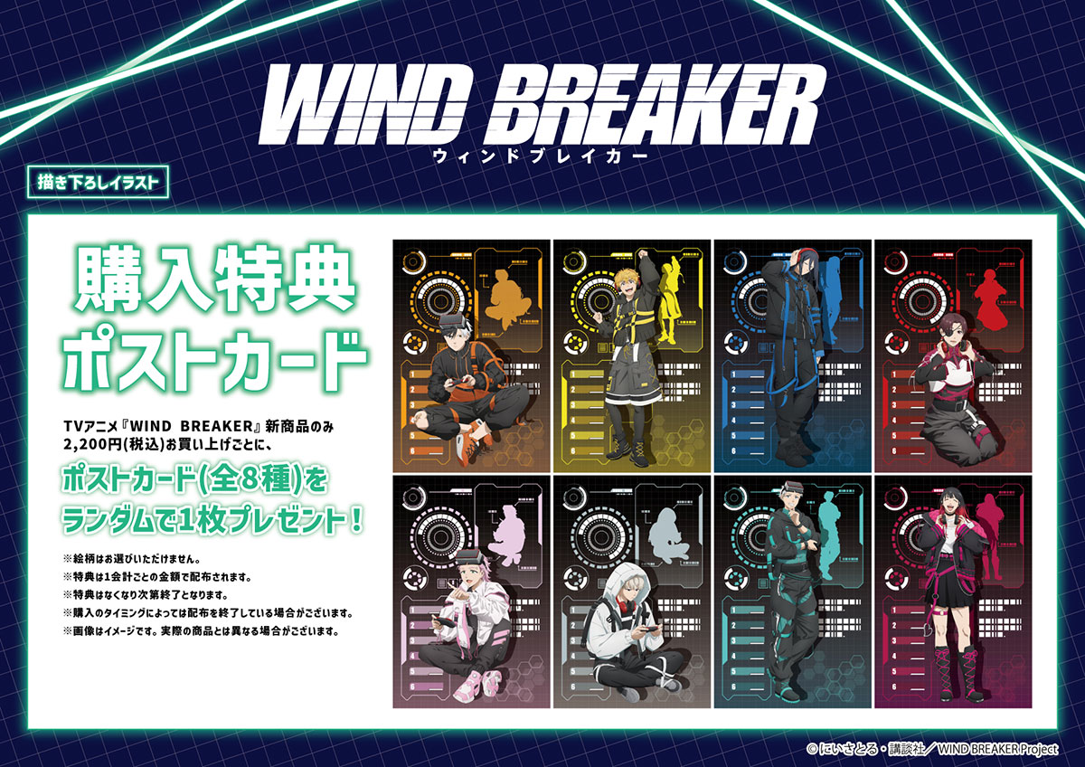 期間中、TVアニメ『WIND BREAKER』新商品のみを2,200円(税込)お買い上げごとに、特典ポストカード(全8種)をランダムで1枚プレゼント!※絵柄はお選びいただけません。